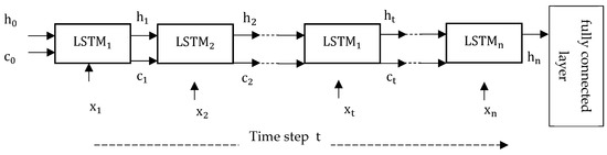 Each LSTM block [21] used the current state of the network represented by and the input sequence to compute the output state, ht, and update the cell state, . The cell state and the hidden state at time step were computed using the following equations: