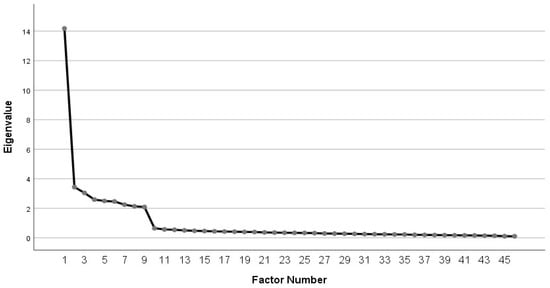 The Scree plot produced nine factors, as shown in Figure 2. KMO was used to determine the variance shared by the indicators, and a score greater than 0.7 was considered favorable. Bartlett tests with a value less than 0.05 were considered significant [54]; the findings which verify the acceptability of data for analysis are shown in Table 1. Cronbach’s alpha was used to determine the internal consistency (reliability) of factors. Table 2 lists all of Cronbach’s alpha results that were more than 0.70 for each group of factors, showing satisfactory reliability. In Table 2, the commonalities and the pattern matrix are also provided. In commonality, the variance is calculated; values closer to one indicate that more variation is explained by the extracted factor, whereas values close to zero indicate a weak match [53]. The pattern matrix’s factors showed unidimensionality, and each item significantly contributed to its estimated factors. The factor correlation matrix depicts either a positive or negative correlation of factors, shown in Table 3.
