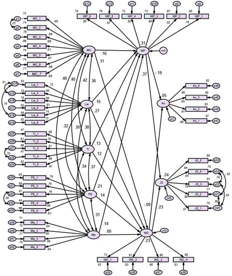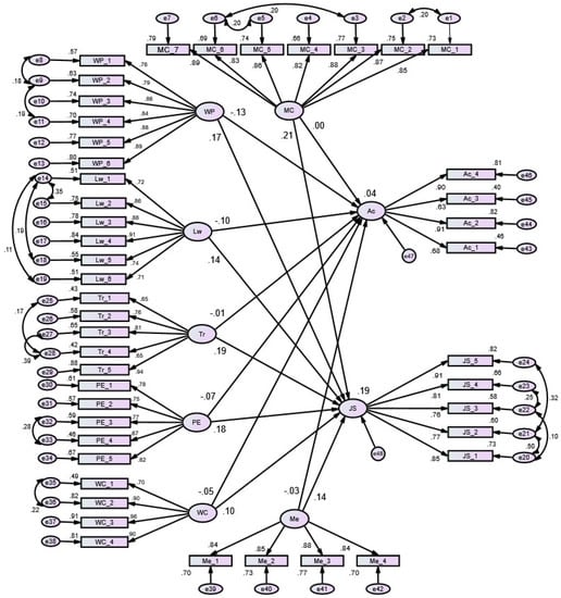 A structure model was constructed to indicate the path among the factors in accordance with the hypothesis, H2, for factors estimated by the measurement model [57]. The initial structure model was tested by rearranging the pathways, as presented in Figure 4. The results produced by the initial structure model are provided in Table 6, Model 1. The results reveal that all the effects of the exogenous factors on Ac and JS factors were either negative or positive with a value of p < 0.05, respectively, excluding the effects (non-Significant) of the factors MC on Ac with p = 0.902, Tr on Ac with p = 0.793, WC on Ac with p = 0.096, and Me on Ac with p = 0.282.