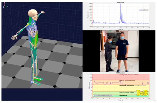 Figure 2 shows several examples of the graphic output capabilities of biomechanical calculations that BoB can generate: 3D graphics and animations of an avatar that recreates the movement of a person, attached to a video synchronized with the animation, and the generation of plots of biomechanical parameters and risk assessment methods.