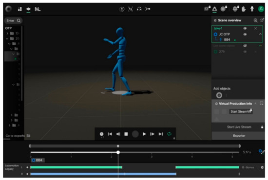 The Rokoko Smartsuit Pro is a suit that fits a single person and has 19 IMUs incorporated. With these sensors, magnetic fields, positions, speeds and accelerations of anatomical parts of a human body are determined. It has a controller that connects to a computer via Wi-Fi. It incorporates a specific software application that allows the display of body positions as avatars on the screen (Figure 3). The controller allows the capturing of up to 100 data series per second.