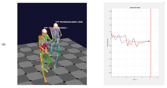 The avatars of the individuals who implemented the techniques to carry out the measurements can be seen on the left side of Figure 6, both at a moment of performing each of the two basic OTPs (Figure 6a) as well as when performing the traditional choke and throw techniques (Figure 6b). Both figures have been captured from the videos that are incorporated as Supplementary Materials to this study. On the videos, you can see how the avatar executes each one of the techniques in real time. It is worth noting the graphical representation of the muscles in the form of ligatures, where they may display from light blue, green, yellow and up to red colors in order to denote the amount of tension exerted by the corresponding muscles at every moment.
