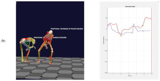 (a) The graph on the right shows the values of the asymmetry angles with respect to the sagittal plane of the body. The blue curve shows the values corresponding to the basic OTP 4 and the red curve represents the basic OTP 1; (b) shows the same values for the choke (red color) and throw (blue color) techniques.