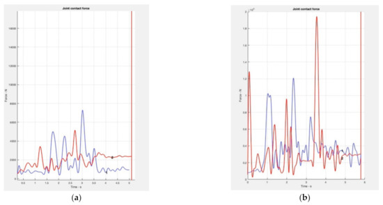 (a) The graph on the right shows the compression force values at the L5-pelvis joint when performing the basic OTP 1 (red color) and OTP 4 (blue color). (b) The blue curve represents the values that this parameter reaches with the choke technique and the red curve corresponds to the throw technique.