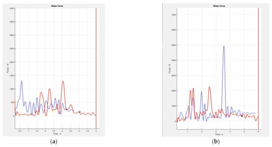 (a) The plot on the right shows the values of the shear forces at the L5-pelvis joint when performing the basic OTP 1 (red color) and OTP 4 (blue color). (b) The blue curve represents the values that this parameter reaches with the choke technique and the red curve corresponds to the throw technique.