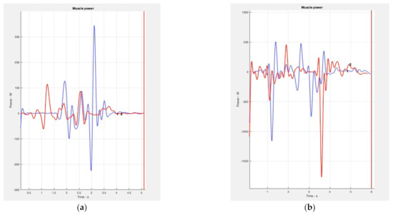 (a) The plot shows the muscle power values when performing the basic OTP 1 (blue color) and OTP 4 (red color). (b) The blue curve represents the values that this parameter reaches with the choke technique and the red curve corresponds to the throw technique.