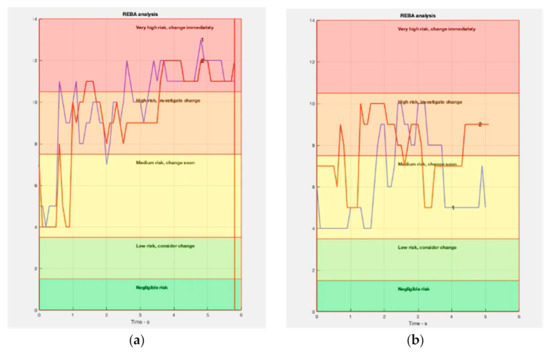 It can be seen in Figure 10 that the basic OTPs do not exceed the set of values labeled as “High risk”. However, traditional techniques scored above the “Very high risk” level for a considerable part of their implementation and were scored as high as 13 in their REBA.
