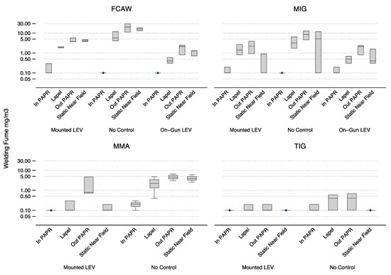 This limited the calculations to samples obtained from FCAW, MIG and MMA welding types only; TIG welding activities did not generate aerosol concentrations greater than the minimum outside concentration. Results from Run 10 (MIG–PAPR Control) were removed from the analysis after observing an instrument error in the real-time data.