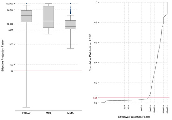 The effective protection factors by welding type and the aggregated distribution of all effective protection factors were combined (Figure 2). The AS/NZS RMPF of 50 is shown on the box-whisker plot for comparison, as is the 5th percentile of the cumulative distribution.