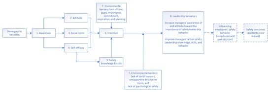 Being aware of the problem (1), having a strong positive intention (6), and possessing the necessary knowledge and skills (5) to perform the required behavior (8) combined with experiencing no or limited environmental barriers (7) to doing so are considered necessary and sufficient to produce a safety-enhancing behavioral change among leaders (8). Attitudes (2: believing that the advantages of performing the new leadership behavior outweigh the disadvantages), social norms (3: perceiving more social pressure to engage in the leadership behavior than not to perform this behavior), and self-efficacy (4: leaders perceiving themselves to be capable of performing the leadership behavior under different circumstances) can weaken or strengthen a behavioral intention.