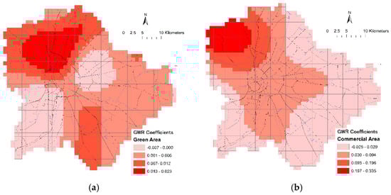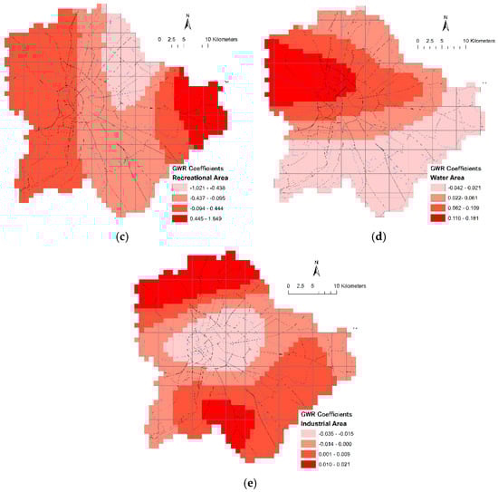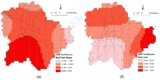 (a–f): GWR Coefficients of the Built Environment and Public Transportation Stops.