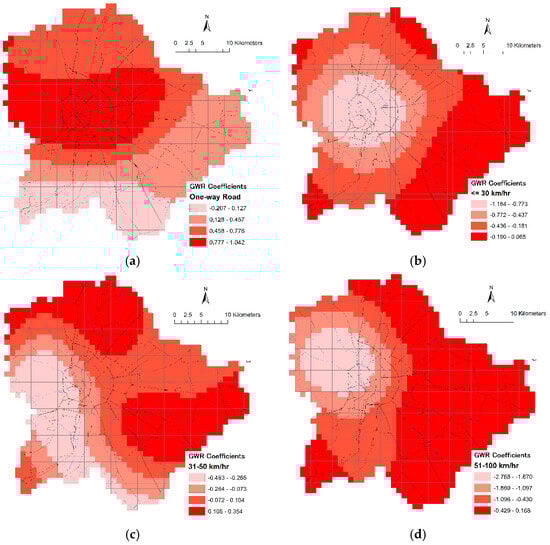 (a–d): GWR Coefficients of the Speed Limits and Road Direction.