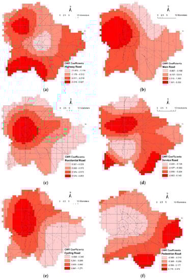 Interestingly, the GWR coefficients for highway roads in the city center were negative, as shown in Figure 4a, indicating that there is almost no correlation between these types of roads and bike crashes in the inner city. This is likely due to the fact that there are very few highways in the city center, which could actually make it safer for cyclists. However, the results also showed that suburban areas with higher speed limits, particularly on the western side where several regional roads are located, had a higher incidence of bike crashes on highway roads. This suggests that further attention may be needed to improve bike safety on these roads outside the city center. For service roads, the coefficients vary spatially in negative and positive manners, as shown in Figure 4d. Finally, GWR analysis showed that pedestrian roads had a negative coefficient, as shown in Figure 4f, indicating that they are correlated with a lower severity of bike crashes. This is likely due to the fact that these roads are designed primarily for pedestrians and have lower traffic volumes, making them safer for cyclists as well. Overall, the findings suggest that interventions to improve bike safety should be tailored to the specific types of roads and areas where bike crashes are most severe.
