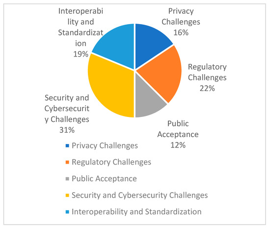 Figure 3 presents the key challenges of deploying UAVs in smart city safety and security. Each category’s percentage is calculated based on the total number of studies (32) mentioned across the categories. Security and Cybersecurity Challenges, addressed in 10 studies, represent 31.25% of the total, underscoring the prominence of cybersecurity concerns in the UAV domain. This emphasizes the importance of developing robust cybersecurity measures, including protection from UAV attacks and ensuring secure communication. Regulatory challenges, discussed in seven studies (21.87% of the total), highlight the significance of creating and enforcing effective regulatory mechanisms for UAV usage. The prevalence of these issues underscores the need for new, comprehensive regulations that ensure public safety and address the specific needs of UAV operations in smart cities. Interoperability and standardization, covered in six studies, comprise 18.75% of the total. This reflects the importance of integrating UAVs seamlessly into existing IoT systems in smart cities and developing new standards for these emerging technologies.