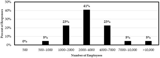 Further survey questions inquired about the size of the agency regarding the number of employees and the percentage of workers who frequently work in construction and/or maintenance operations. Figure 2 shows that no responding agency operates with fewer than 500 employees, while most agencies range between 2000–4000 employees (41%).