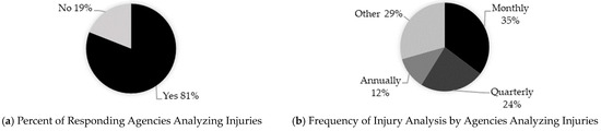 The survey identified common and unique injury trends experienced by state DOTs. Recognizing trends and common hazards facilitates the implementation of effective countermeasures, and the evaluation of successes and the comparison of different data sets and time frames. In total, 81% of the respondents reported that their agencies analyze injury trends consistently, as shown in Figure 6a. Respondents who answered “Yes” to performing injury analysis were then prompted to indicate the frequency of the analysis. The most common analysis frequency reported was monthly, as shown in Figure 6b. Other reported frequencies included weekly, depending on requests and agency demands.
