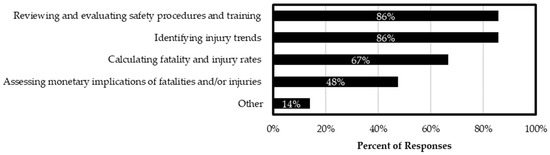 Maintaining records allows agencies to comply with mandatory OSHA regulations pertaining to recordkeeping. More critically, it also provides an efficient tool with which to identify injury trends, assess the monetary implications of fatalities and/or injuries, investigate current procedures, plan future improvements to guidelines and procedures, as well as evaluate the success of employed measures. Figure 7 shows that the majority of responding agencies use injury records to review and evaluate safety procedures and training (86%), as well as identify injury trends (86%). Other reported uses included improving the recordkeeping, recording and evaluation process for senior leaders/supervisors.