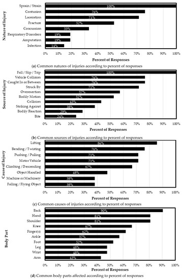 As part of the questionnaire, a distinction was made between the source and cause of injuries. The source mainly describes “the manner in which the injury was produced or inflicted” [20], while the cause of injury identifies the object, substance, bodily motion, or exposure that directly produced or inflicted the injury. The most cited sources of injury according to the percentage of responses are shown in Figure 8b, with Fall/Slip/Trip (100%), Vehicle Collision (76%), Caught In or Between (76%), Struck By (71%), and Overexertion (57%).
