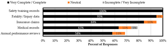 Most available sources identified in the survey included safety training records, injury/fatality data, and insurance claims, as seen in Figure 10. Respondents were asked to rank these sources on a scale from 1–5, 5 being very complete and 1 being very incomplete. The average “completeness” rank was as follows: safety training records (4.6), fatality/injury data (4.5), insurance claims (4.1), medical records (3.4), and annual performance reviews (3.2). These sources include much of the main safety information necessary for reviewing, improving, and evaluating safety programs and policies. Medical records and annual performance reviews scored lower in completeness, which may indicate restrictions on the availability of information due to confidentiality or health information privacy concerns.