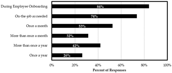 Regarding the frequency with which safety meetings are held, 89% of the respondents indicated that their supervisors hold regular safety meetings with employees, as shown in Figure 14. The least reported element of the safety focus was acquiring safety and health guidance from the insurance company of the state DOT. Other reported elements included the following: communication, safety orientations, training throughout the year as needed, conducting incident safety reviews, encouraging the use of a safety application in safety meetings and daily safety huddles, and working hard to use all safety and injury information effectively.