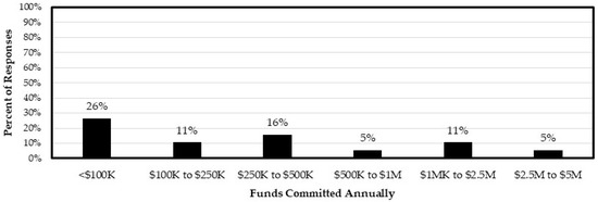 The survey also explored the percentage of DOTs committing funds annually to the successful implementation of a safety program and/or safety initiative(s). In total, 74% of the respondents indicated that their agencies commit funds annually to the implementation of a safety program and/or safety initiative(s). The amount of funds committed annually according to the percent of responses is shown in Figure 15. The respondents reported to commit USD 2.5 M to USD 5 M had more than 10,000 employees at their agency, with a zero-fatality rate and the lowest reported non-fatal injury rate of 0.94 per 100 FTE.