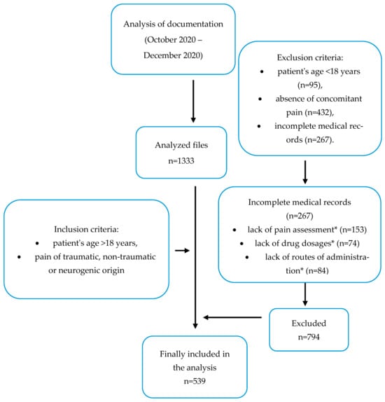 Initially, a total of 1333 paper emergency medical team cards were included in the analysis during the selected time frame. Finally, 539 (40.4%) cases were qualified for the analysis according to the inclusion and exclusion criteria (Figure 1). This study was based on the analysis of pain treatment in adult patients only; therefore, 95 (7.1%) cards of <18-year-old patients were excluded from the research. A total of 432 (32.4%) cards were excluded due to patients calling the EMT for a reason other than pain, while 267 (20.1%) cards were excluded due to incomplete medical records, making it impossible to objectively analyze pain treatment.