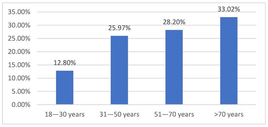 The patients whose records were analyzed were classified into four age groups: I: 18–30 years, II: 31–50 years, III: 51–70 years, and IV: over 70 years. The largest group of study patients was in the age range of over 70 years—33.02%; while the smallest was in the age range of 18–30 years—12.80%. The size of groups II and III was comparable at 25.97% and 28.20%, respectively (Figure 2).