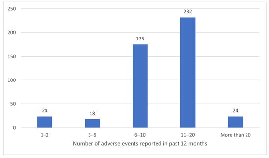 As shown in Figure 1, there is a high frequency of event reporting that can be observed among the participants, as most of them reported 11–20 events (49.1%) or 6–10 events (36.9%) in the past 12 months.