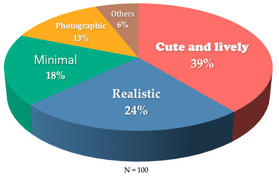According to the results shown in Figure 2, the respondents favored a cute and lively theme the most (39%), followed by a realistic theme (24%), a minimal theme (18%), a photographic theme (13%), and other themes (6%). The conclusion drawn from these results is that the characters should be designed in a cute and lively theme.