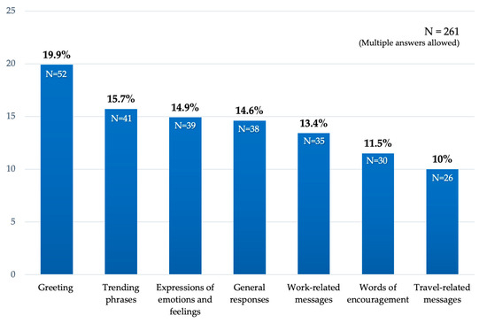According to the findings in Figure 3, the respondents expressed a preference for various communication goals when utilizing stickers. The most popular choice was greetings at 19.9%, followed by messages related to trending phrases at 15.7%, and expressions of emotions and feelings at 14.9%. General responses were favored at 14.6%, with work-related messages coming in at 13.4%. Additionally, words of encouragement at 11.5%, and travel-related messages at 10% were also noted. The results were concluded and used for creating text and phrases for the subsequent sticker design.