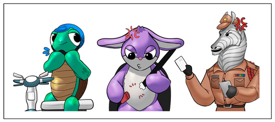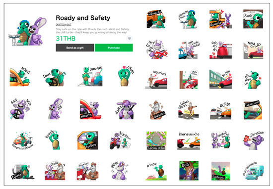 The Line stickers were carried out using Clip Studio Paint Pro software version 2.0 (CELSYS, Inc., Tokyo, Japan) for drawing the draft, coloring, and arranging texts and messages in Thai. After that, all images were provided to the same group of participants involved in the group discussion to give feedback, opinions, and additional suggestions. The stickers were edited following the feedback and suggestions received before launching this set of stickers in the Line Store. Figure 5 illustrates the conceptual sketches of the three characters, developed through the participatory design (PD) process. The sticker set was named “Roady and Safety” with Roady being the name of the rabbit character, and Safety being the name of the tortoise character. The stickers were 40 static image stickers with dimensions of 370 pixels in width and 320 pixels in height. These stickers can be downloaded at https://store.line.me/stickershop/product/23957699 (accessed on 15 November 2023) (Figure 6).