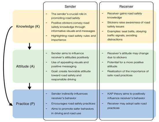 The sender is the person or entity initiating the communication. In this context, the sender can be an individual, a road safety organization, a government agency, or any entity interested in promoting road safety. The sender is responsible for creating or selecting the stickers related to road safety and using them to convey a message. Their role is to disseminate information and influence the receiver’s knowledge, attitudes, and practices related to road safety through the stickers.