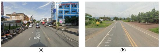 Physical characteristics of roads and environments in urban and rural areas. Source: Google Maps. (a) Urban area (coordinates: 14.9751957, 102.0855722), (b) rural area (coordinates: 17.0303607, 101.2773004).
