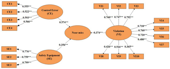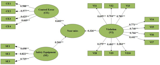Structural equation modeling (SEM) is a powerful and widely employed multivariate technique in scientific research for investigating and evaluating complex relationships among variables. SEM combines two statistical methods: confirmatory factor analysis and path analysis. Confirmatory factor analysis is primarily used to estimate latent psychological traits like attitude and satisfaction. On the other hand, path analysis originated in biometrics and aims to identify causal relationships between variables by constructing a path diagram [56]. In the confirmatory factor analysis section of this study, our objective was to identify the components of motorcycle rider behavior, encompassing control errors, violations (VI), and safety equipment (SE), designated as latent variables. In the path analysis section, our focus was on elucidating the relationships between these latent variables and near-miss incidents, aiming to ascertain whether a correlation exists and, if so, the extent of that correlation.