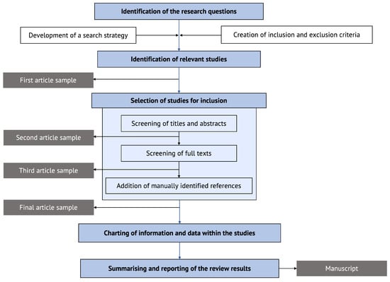 - Peters, M.D.; Godfrey, C.M.; Khalil, H.; McInerney, P.; Parker, D.; Soares, C.B. Guidance for conducting systematic scoping reviews. Int. J. Evid. Based Healthc. 2015, 13, 141–146. [Google Scholar] [CrossRef] [PubMed]