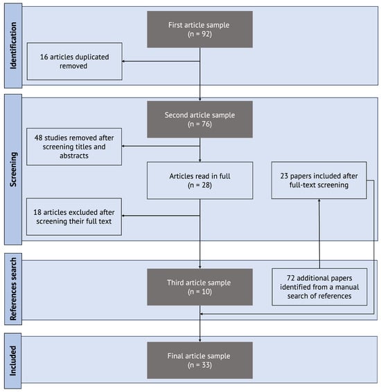 The studies identified through the search strategy (see Section 2.3) formed the first sample of articles (see Figure 1), which contained 92 papers. Once the first sample was obtained, we proceeded with its refinement. Accordingly, two screening processes were undertaken in this step, and the inclusion and exclusion criteria guided these processes.