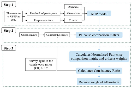 To answer Research Question 1, we reviewed the literature on weighting methods that can be used to design exercise scenarios and injects. We chose to use the analytic hierarchy process (AHP) for our design. The AHP typically considers the following three layers in its decision models: objectives, evaluation criteria, and alternatives [18,19]. A functional exercise on landslides conducted at the University of Fire Prevention and Fighting (UFPF), Vietnam, in 2022, became a reference case, and its objectives, evaluation criteria, and alternatives were specified. The evaluation criteria featured response action types, and the alternatives featured response capabilities.