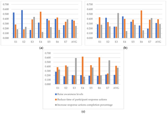 The importance weights were calculated using Saaty’s method [54]. A pairwise comparison matrix was used to calculate the importance weights across the action types for each disaster type and expert. The importance weights across the capabilities for completing each action type were then calculated for each disaster type by each expert. The synthesized weights of the capabilities required to respond to each type of disaster were then calculated for each expert.