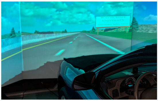 EACPHS Driving Simulator: Study participants were seated in a fixed-base driving simulator (DriveSafety, Inc., Draper, UT, USA) that consists of a four-door vehicle (2000 Chevrolet Impala) fully equipped with steering wheel, pedals, ignition switch, gear shift, rear and side view mirrors, headlights, turn signals and a radio (see Figure 1). A fully immersed virtual driving experience was created with six networked computers generating the simulated roadway via three forward projection screens (left, center, right) to provide a 150-degree forward field of view and one rear projection screen. Driving scenarios were created using HyperDrive software (Version 1.6.2), a tile-based scripting tool.