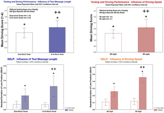 The disruptive effects of texting on driving performance are potentiated by increased text message length or increased driving speed. Plotted are mean ± 95% confidence interval values obtained from 9 subjects. Left panels (blue symbols) are results for different text message lengths (one-word texts vs. 8–10-word texts), and right panels (red symbols) are results for different driving speeds (60 mph vs. 80 mph). Upper panel: mean driving scores as assessed from videos. (Note: 1.0 = no significant deviation from the center of the travel lane). Lower panel: Standard Deviation of Lane Position (SDLP; in meters) values for the 5 s period before (open columns) and during (filled columns) texting. * Values obtained during texting were statistically different from non-texting periods. ++ Values obtained for long text messages were statistically different from short text messages, or values obtained during texting at 80 mph were statistically different from 60 mph.