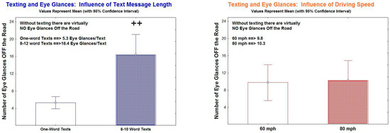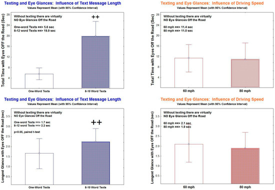 Differential effects of increased text message length or driving speed on the effects of texting while driving on the number of eye glances off the road. Plotted are mean +95% confidence interval values obtained from 9 subjects. Left panels (blue symbols) are results for different text message lengths (one-word texts vs. 8–10-word texts), and right panels (red symbols) are results for different driving speeds (60 mph vs. 80 mph). ++ Values obtained for long text messages were statistically different from short text messages.