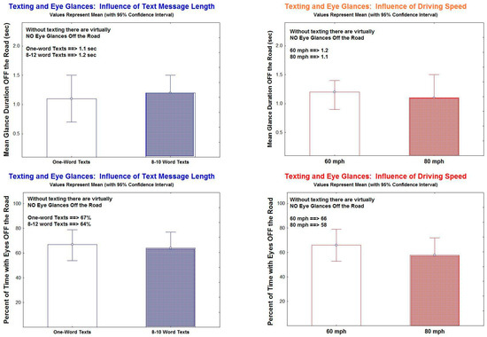 Varying text message length or driving speed did not affect either the mean duration of eye glances away from the road (top panel) or the percent of total testing time spent with eyes off the road. Plotted are mean +95% confidence interval values obtained from 9 subjects. Left panels are results for different text message lengths (blue symbols; one-word texts vs. 8–10-word texts), and right panels (red symbols) are results for different driving speeds (60 mph vs. 80 mph).