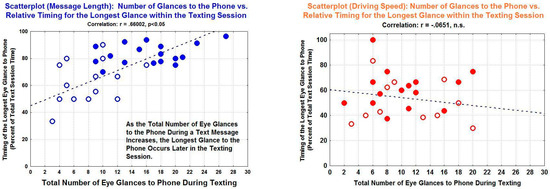 Differential effects of changing text message length and driving speed on the relationship between the total number of eye glances to the phone and the relative location (early versus later in the texting episode) for the longest single eye glance to the phone. Left panel: open symbols are from the short text messages, whereas the filled symbols are from the longer text messages. Right panel: open symbols are from 60 mph driving speed, whereas the filled symbols are from 80 mph driving speed. As can be seen in the left panel scattergram, the single longest eye glance away from the phone occurs later into the texting/driving episode for longer and longer text messages; as seen in the right panel scattergram, there is no correlation between these two measures when texting while driving was examined at 60 versus 80 mph.