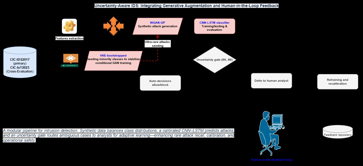 | Our Approach (2025) | CIC-IDS2017 (primary), CIC-IoT2023 (cross-eval) | Calibrated CNN–LSTM | VAE-seeded cWGAN-GP generative balancing | Yes (CIC-IDS2017 → CIC-IoT2023) | Yes (temperature scaling; ECE/Brier reported) | Yes (uncertainty-based analyst deferral) |