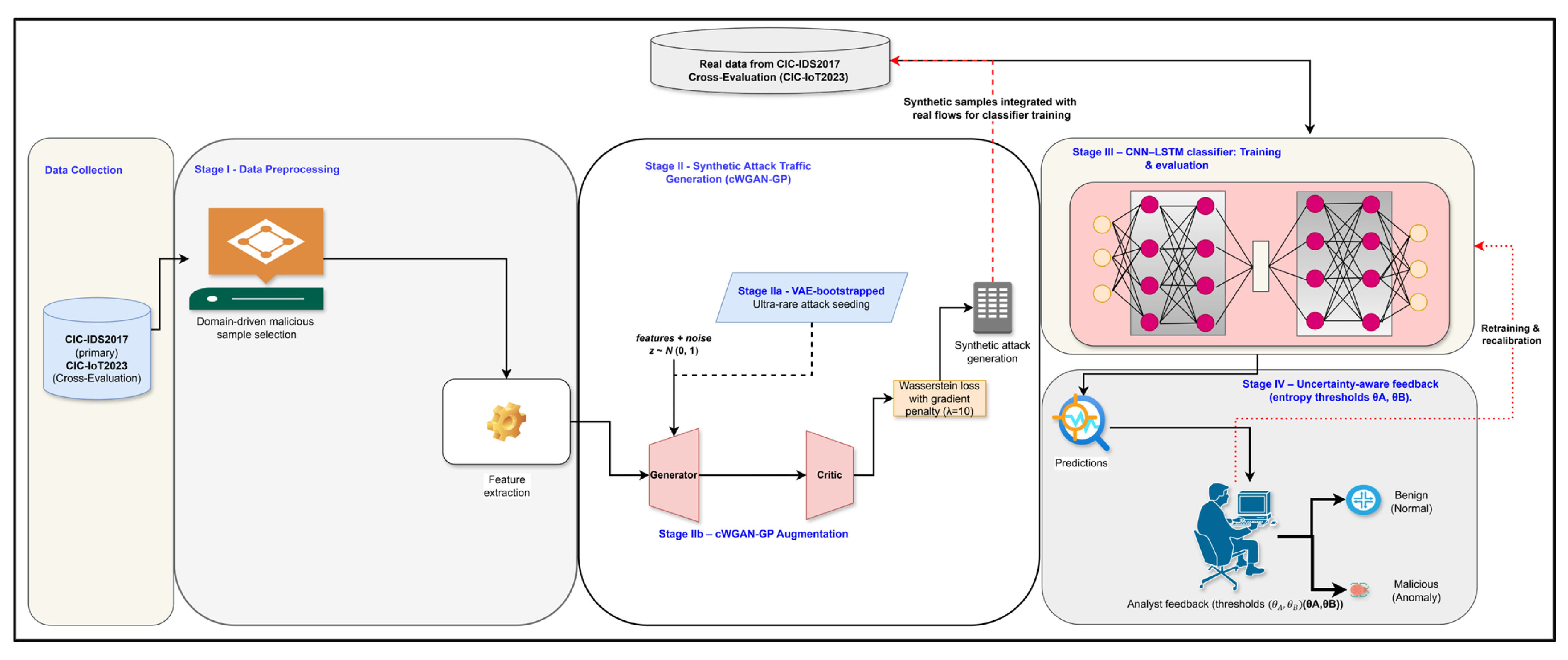 Proposed uncertainty-aware intrusion detection workflow. Stage I performs leakage-safe preprocessing on CIC-IDS2017 (primary) and CIC-IoT2023 (cross-evaluation), including domain-driven selection of minority attacks and feature extraction. Stage II introduces generative augmentation: (IIa) a variational autoencoder (VAE) bootstraps ultra-rare classes, and (IIb) a conditional Wasserstein GAN with gradient penalty (cWGAN-GP) synthesizes diverse attack flows that are merged with real traffic. Stage III involved training the calibrated CNN–LSTM classifier using the combined dataset. Stage IV applies entropy-based thresholds (θA, θB) to defer uncertain predictions to analysts; their feedback is logged for periodic retraining and recalibration.