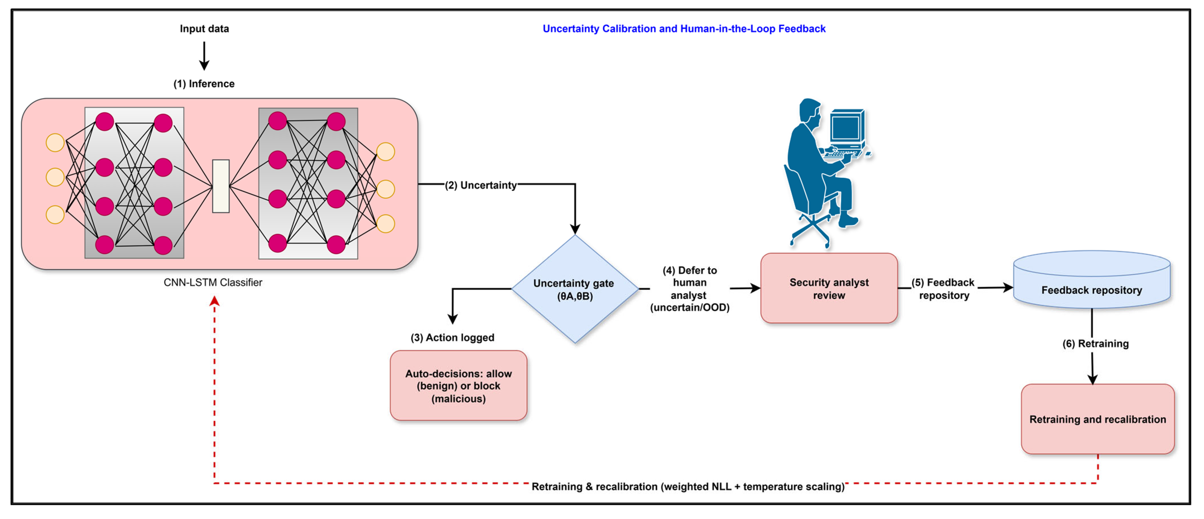 The uncertainty calibration and analysis feedback mechanisms are discussed. Predictions passing through the entropy-based uncertainty gate are either auto-decided (benign/malicious) or deferred to a human analyst for evaluation. Analyst feedback is stored in a repository and used for retraining and recalibration via weighted NLL and temperature-scaling.