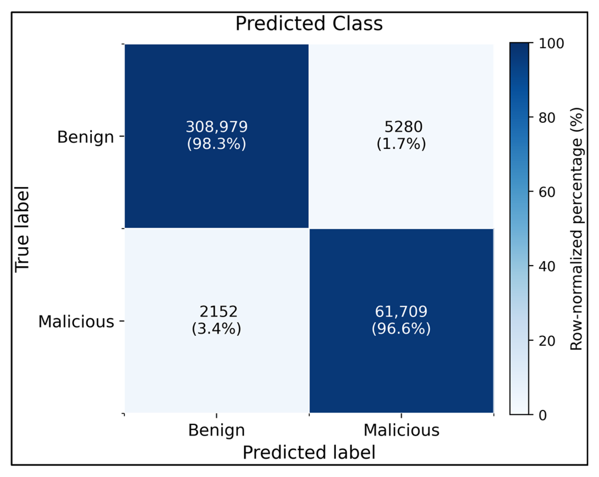 Binary confusion matrix for the baseline CNN–LSTM on the CIC-IDS2017 test split using all 46 features. The classifier correctly identified 98.3% of benign flows (308,979/314,259) and 96.6% of malicious flows (61,709/63,861), with only 1.7% false positives and 3.4% false negatives, demonstrating a high-fidelity benign–malicious separation.