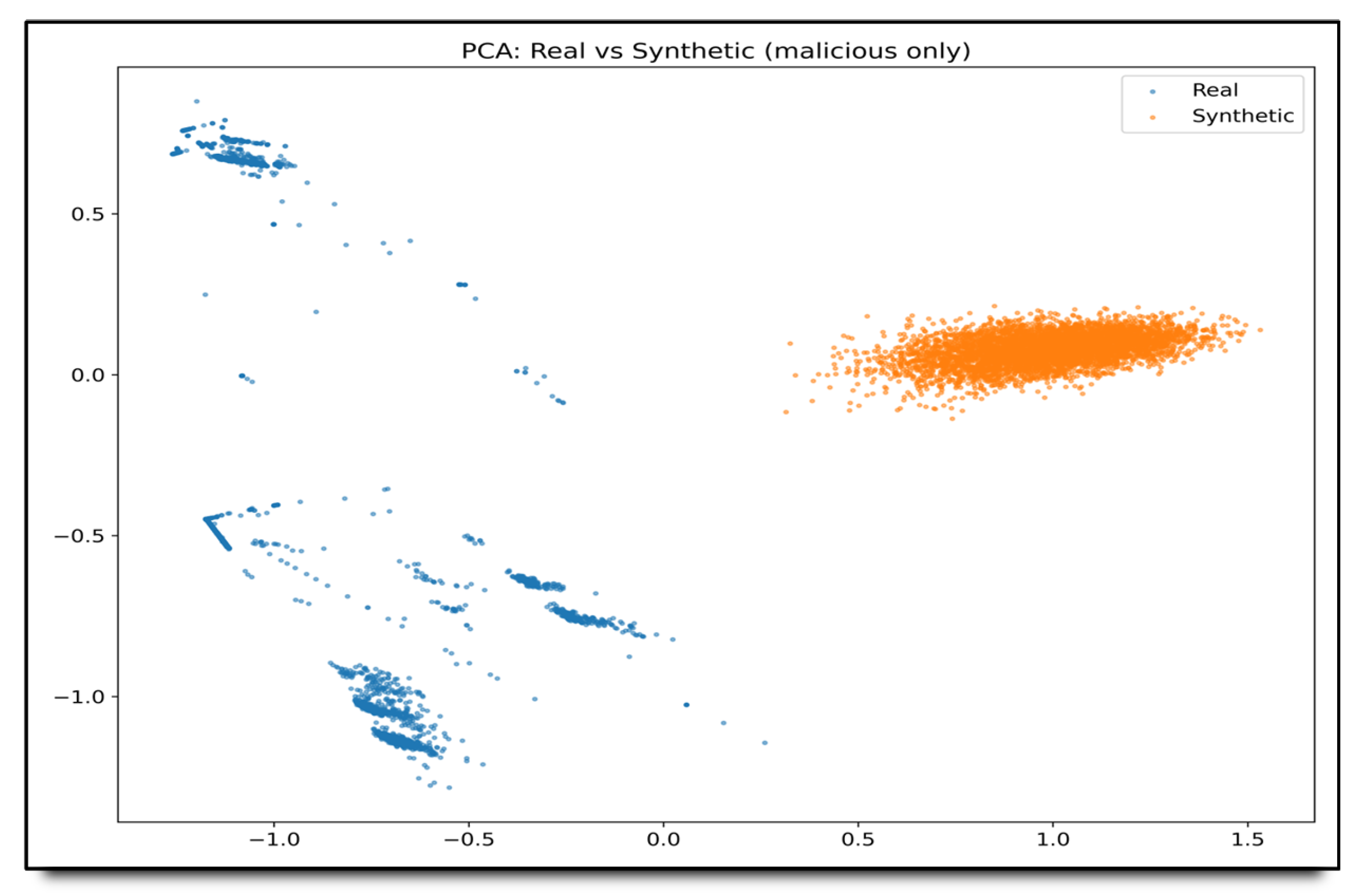 PCA visualization of real versus synthetic malicious flows. The 2D embedding reveals that real attack traces (blue) occupy a broader manifold, whereas cWGAN-GP samples (orange) cluster tightly, indicating a reduced intra-class diversity. This divergence underscores the need for additional regularization or conditioning to better match the variability of real-world attack behavior.