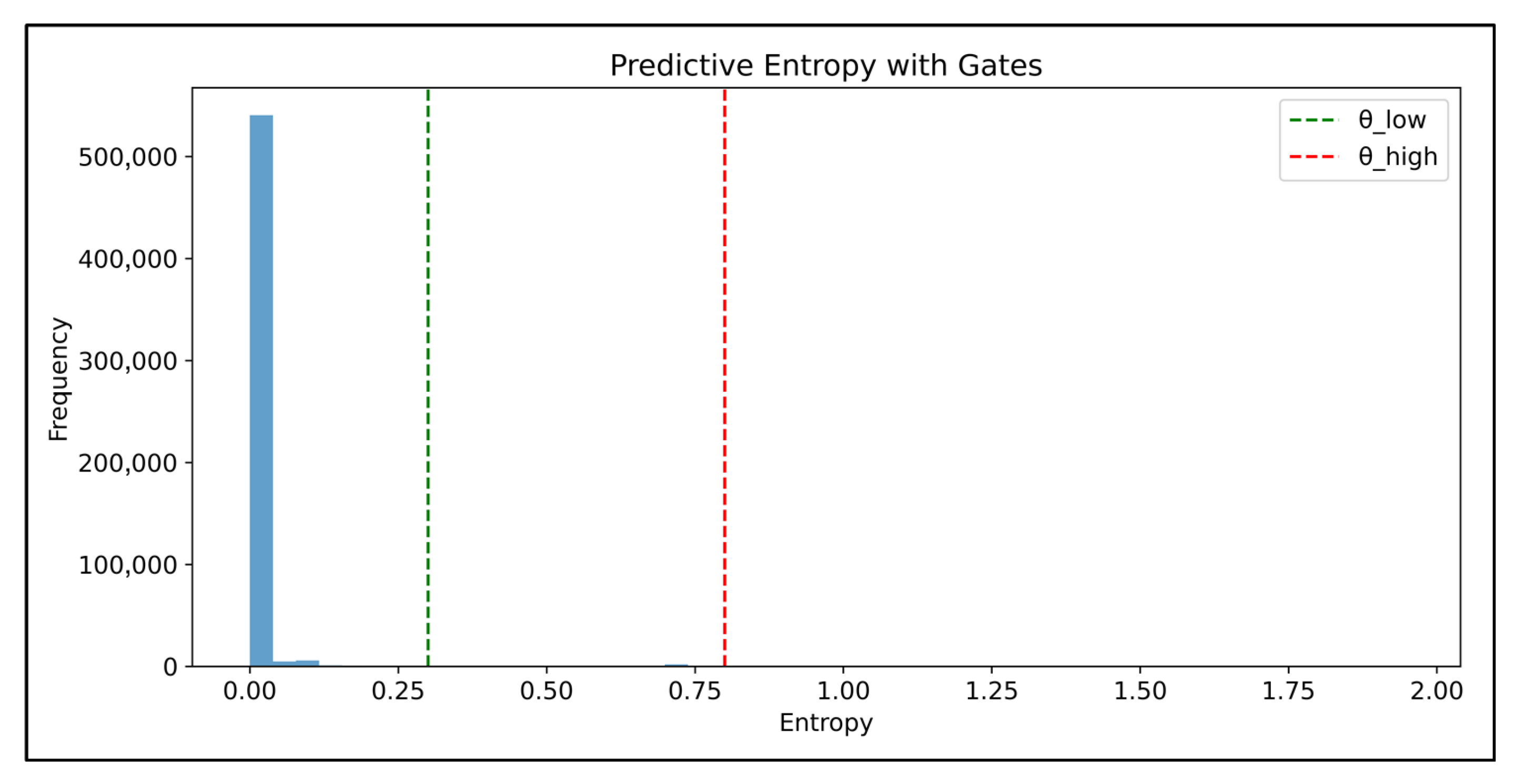 Predictive entropy distribution for the calibrated CNN–LSTM on CIC-IDS2017 (validation set) under the hu-man-in-the-loop gating policy. The dashed lines mark the low threshold (green) used for auto-acceptance and the high threshold (red), indicating high-confidence decisions, whereas only a small tail is routed to the feedback queue.