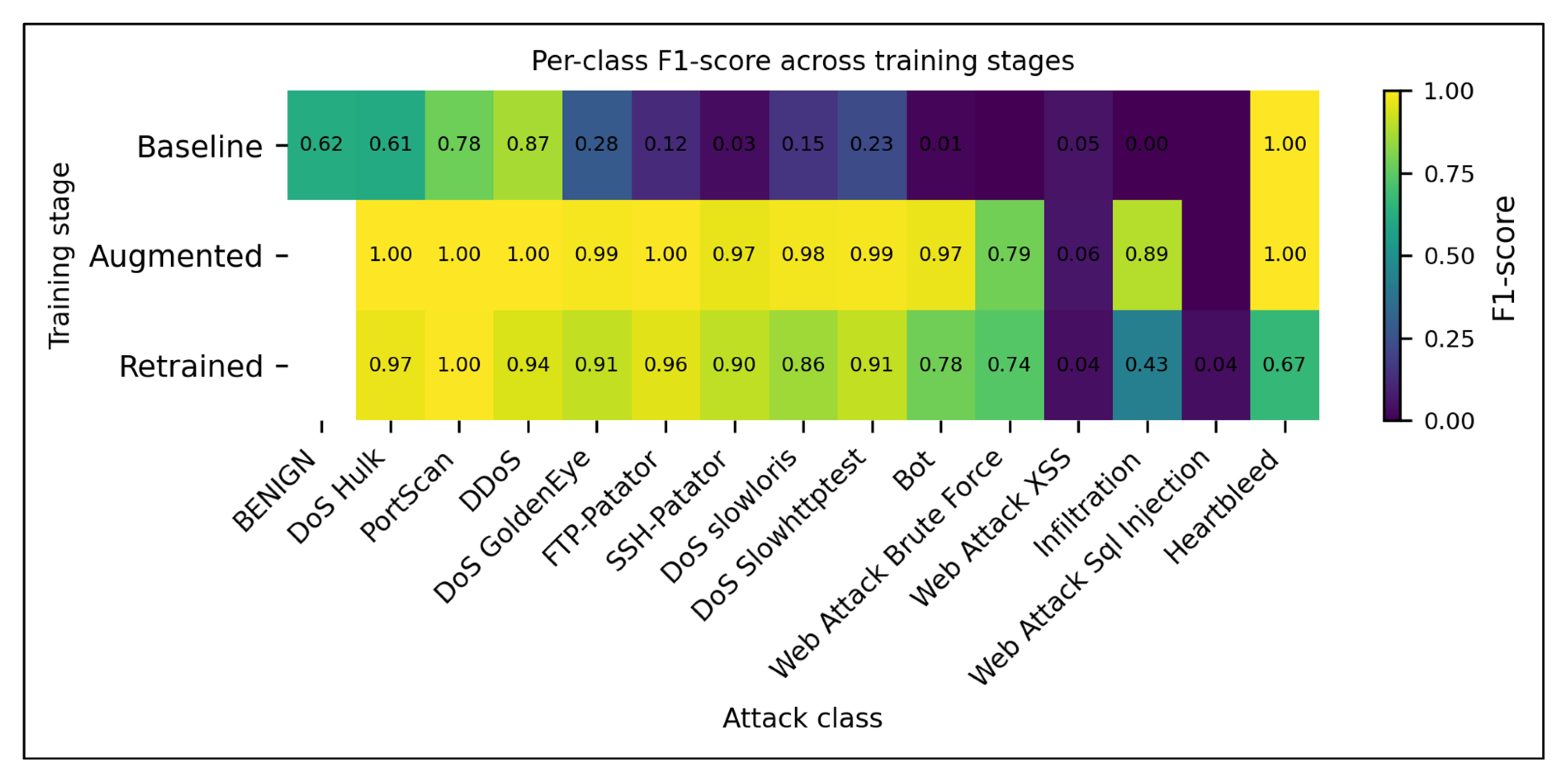 Per-class F1-scores for CNN–LSTM across the three pipeline stages (baseline, GAN-augmented, and feedback-retrained). Augmentation boosts F1 dramatically for most minority classes (e.g., FTP-Patator, SSH-Patator, Bot), and uncertainty-guided retraining preserves most of those gains while stabilizing benign performance. The values embedded in each cell represent the exact classwise F1.